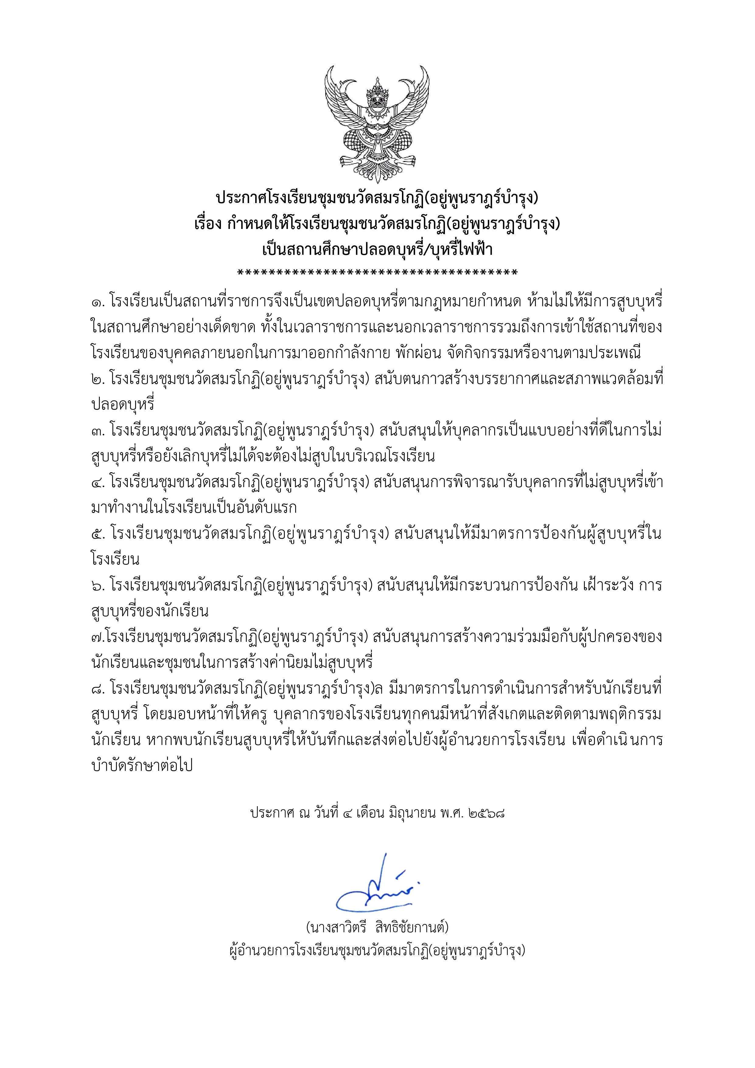 ประกาศโรงเรียนชุมชนวัดสมรโกฏิ(อยู่พูนราษฎร์บำรุง) เรื่อง นโยบายการป้องกันและแก้ไขปัญหายาเสพติด โครงการสถานศึกษาสีขาว ปลอดยาเสพติดและอบายมุข 17 ก.พ. 68