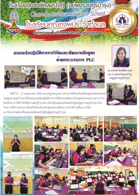 อบรมเชิงปฏิบัติการการวิจัยและพัฒนาหลักสูตรด้วยกระบวนการ PLC โดยมี ดร. สาวิตรี สิทธิชัยกานต์ ผู้อำนวยการโรงเรียนชุมชนวัดสมรโกฏิ(อยู่พูนราษฎร์บำรุง)